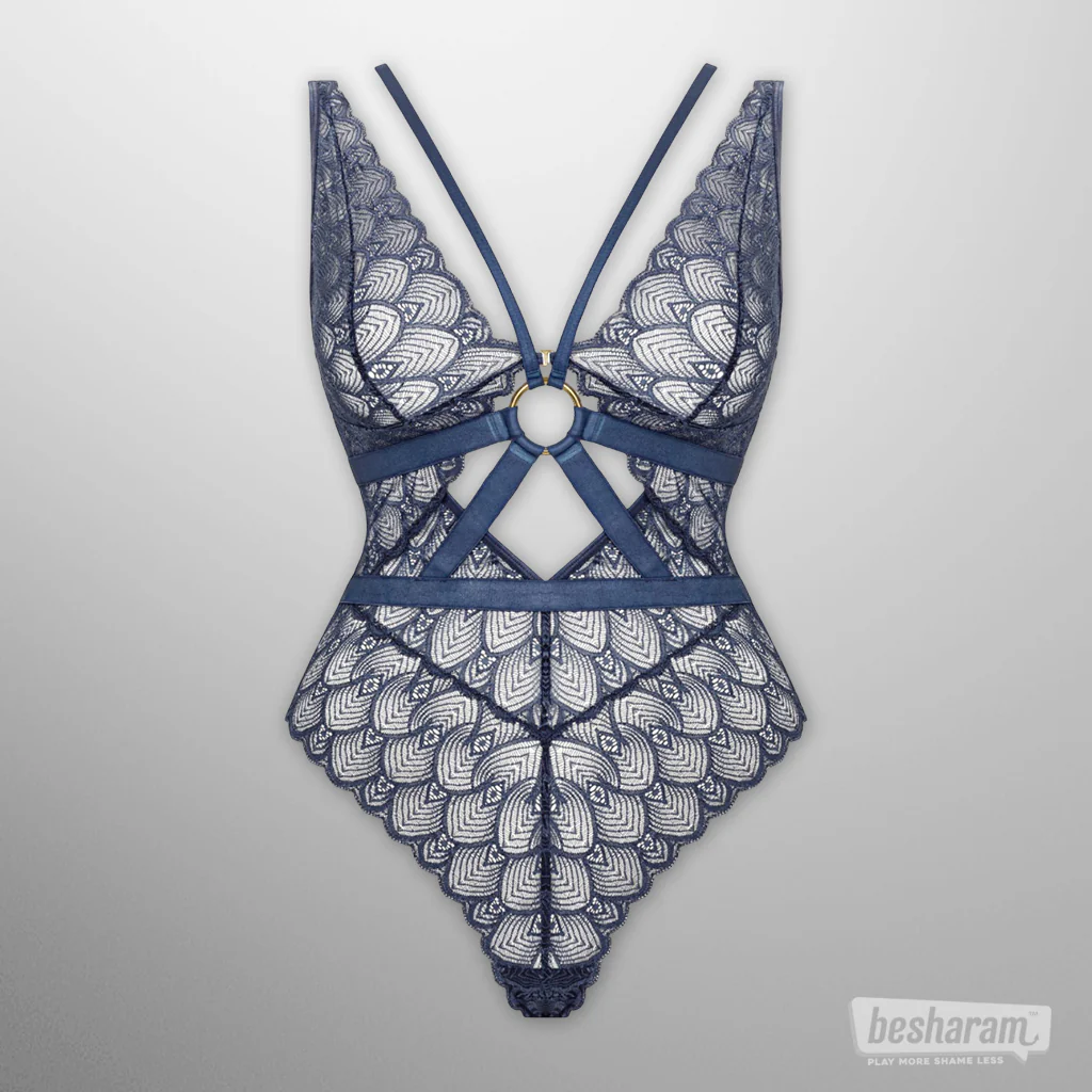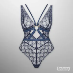 The Christine Sweetest Taboo Body is designed to tempt. Crafted from luxurious lace in a rare denim-blue shade, its feather-inspired pattern feels both sensual and refined. The high-leg cut and sheer triangle cups flatter your shape, while golden accents add just the right touch of elegance. The harness-style straps across the bodice bring a bold, seductive edge — wear it with the harness for a powerful look, or remove it to let the delicate lace take center stage.